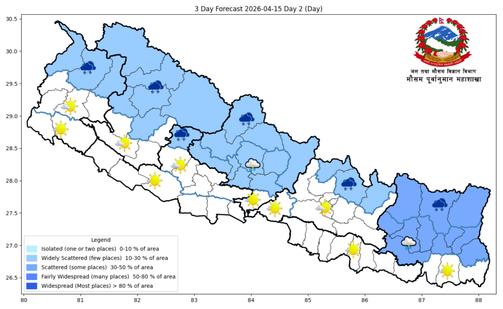 महाशाखाका अनुसार कोशी, बागमती र गण्डकी प्रदेशको हिमाली भू-भागका एक-दुई स्थानमा हल्का वर्षा र हिमपातको सम्भावना रहेको छ।