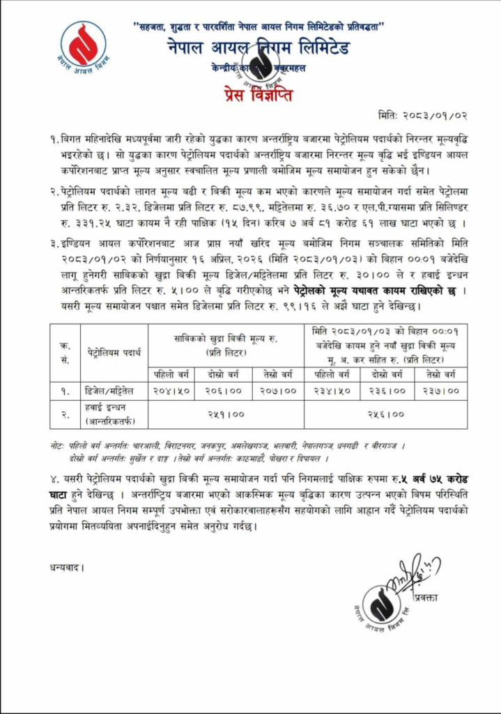 हाल मुल्य समायाेजन गर्दा समेत पेट्रोलमा प्रतिलिटर दुई रुपैयाँ ३२ पैसा, डिजलमा प्रतिलिटर ८७ रुपैयाँ ९९ पैसा, मट्टीतेलमा ३६ रुपैयाँ ७० पैसा र खाना पकाउने एलपी ग्यासमा प्रतिसिलिण्डर तीन सय ३१ रुपैयाँ २५ पैसा घाटा कायम रहेको निगमले जनाएको छ ।