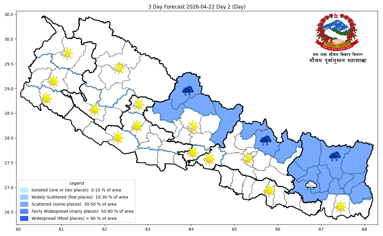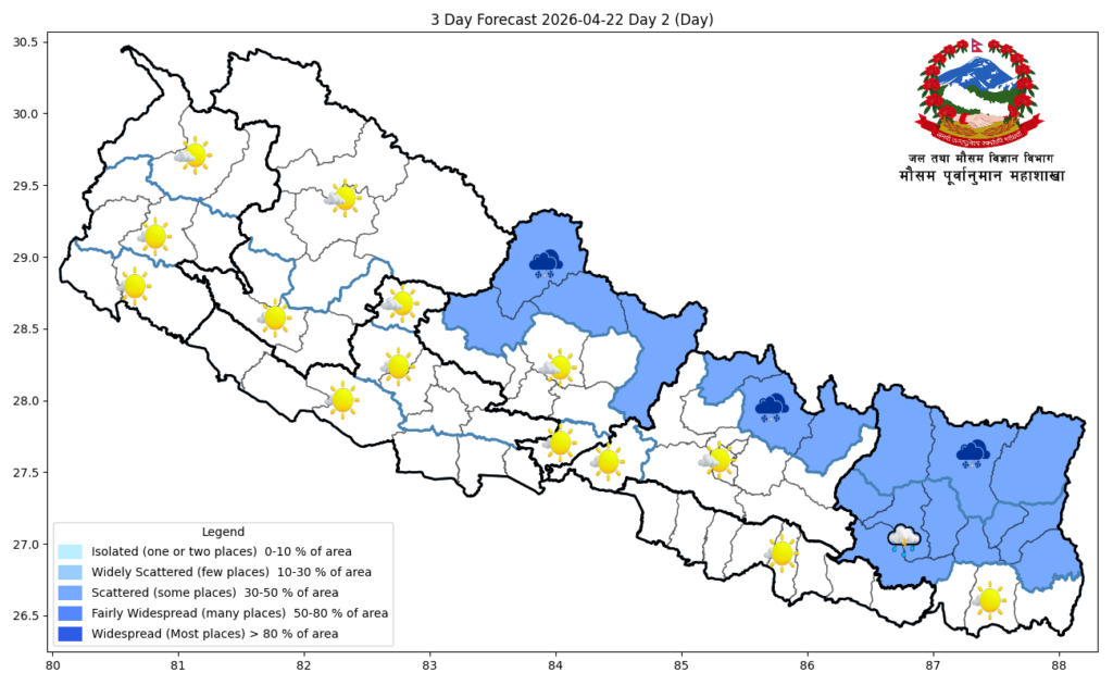 जल तथा माैसम विज्ञान विभाग, माैसम पूर्वानुमान महाशाखाका अनुसार बुधबार दिउँसाे कोशी, बागमती र गण्डकी प्रदेशका हिमाली भू-भागमा साधारणतया बादल लाग्नेछ भने बाँकी प्रदेशका हिमाली भू-भागका साथै कोशी, बागमती, गण्डकी र कर्णाली प्रदेशका पहाडी भू-भागमा आंशिक बादल  लाग्ने र बाँकी भू-भागमा मौसम मूख्यतया सफा रहनेछ।